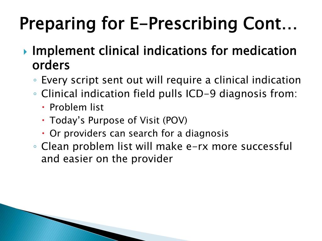 Preparing for E-Prescribing Cont… • Implement clinical indications for medication orders • Every script sent out will require a clinical indication • Clinical indication field pulls ICD-9 diagnosis from: • Problem list • Today’s Purpose of Visit (POV) • Or providers can search for a diagnosis • Clean problem list will make e-rx more successful and easier on the provider