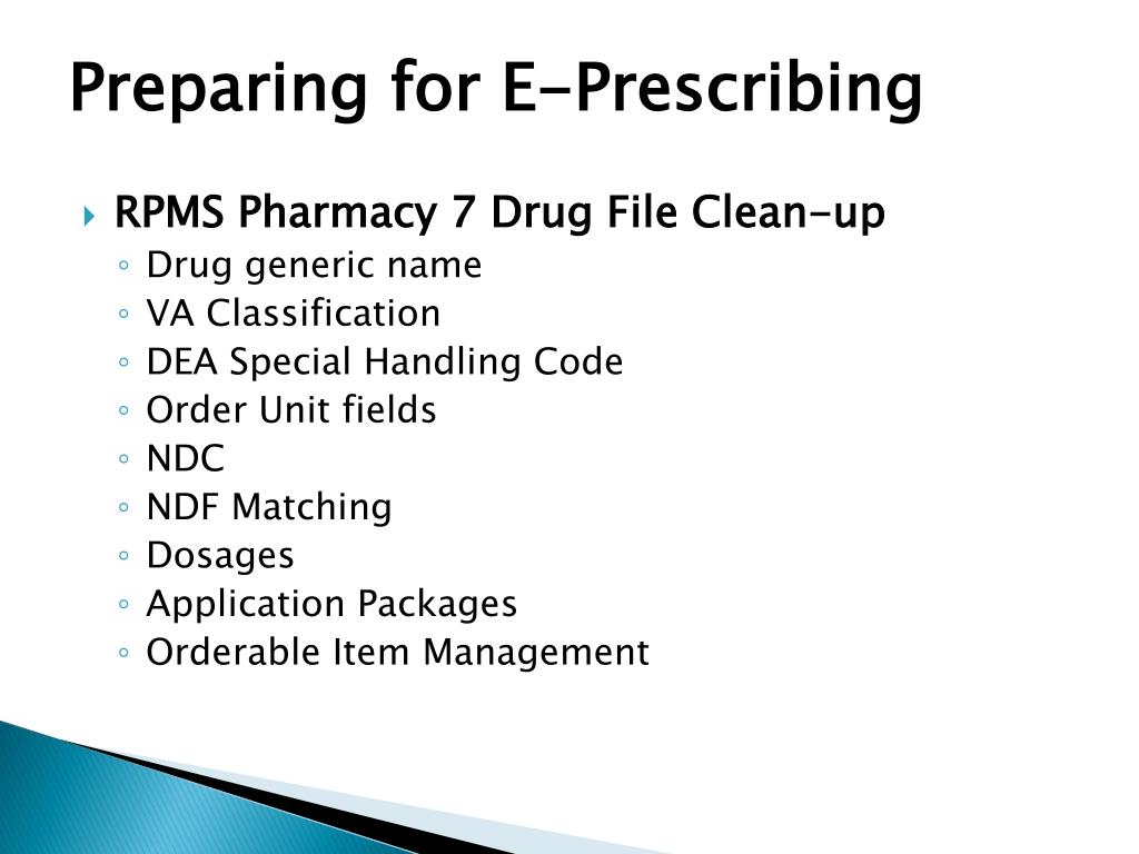 Preparing for E-Prescribing • RPMS Pharmacy 7 Drug File Clean-up • Drug generic name • VA Classification • DEA Special Handling Code • Order Unit fields • NDC • NDF Matching • Dosages • Application Packages • Orderable Item Management