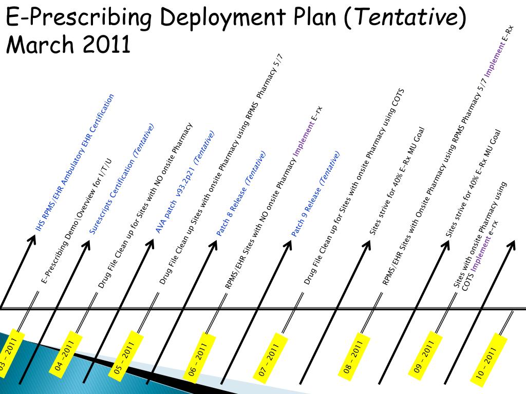 E-Prescribing Deployment Plan (Tentative) March 2011 Sites strive for 40% E-Rx MU Goal Surescripts Certification (Tentative) RPMS/EHR Sites with Onsite Pharmacy using RPMS Pharmacy 5/7 Implement E-Rx AVA patch v93.2p21 (Tentative) RPMS/EHR Sites with NO onsite Pharmacy Implement E-rx IHS RPMS/EHR Ambulatory EHR Certification Drug File Clean up Sites with onsite Pharmacy using RPMS Pharmacy 5/7 Sites strive for 40% E-Rx MU Goal Patch 8 Release (Tentative) Patch 9 Release (Tentative) E-Prescribing Demo\Overview for I/T/U Drug File Clean up for Sites with NO onsite Pharmacy Drug File Clean up for Sites with onsite Pharmacy using COTS Sites with onsite Pharmacy using COTS Implement e-rx 03 - 2011 04 -2011 09 - 2011 05 - 2011 08 - 2011 06 - 2011 07 - 2011 10 - 2011