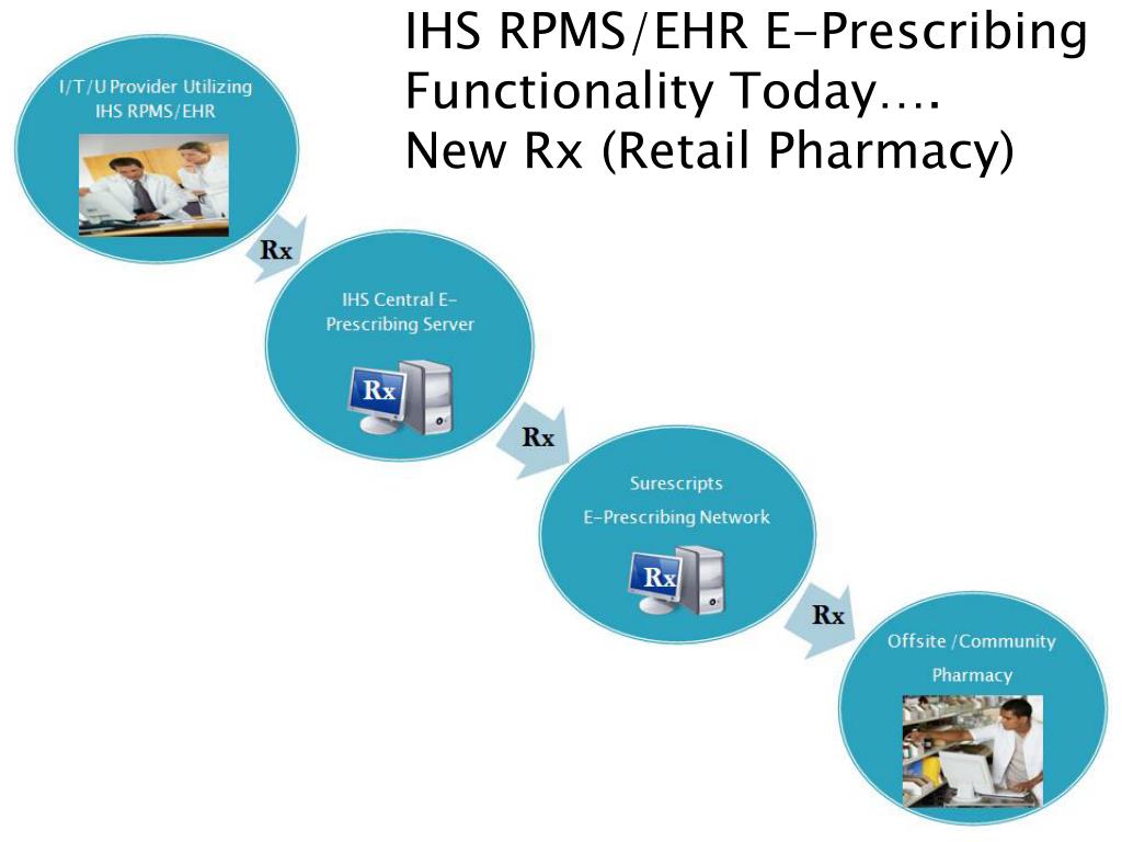 E-Prescribing Terminology • I/T/U • IHS Federal Sites/Tribal/Urban Clinic Setting • Onsite Pharmacy • Pharmacy located “within” the health care clinic of an I/T/U site • Offsite Pharmacy • Pharmacy located outside of the I/T/U setting • AKA community pharmacy • Wal-Mart, Walgreens, CVS, Target, local “mom-n-pop” pharmacy, etc.