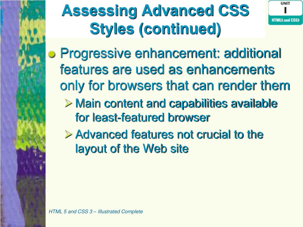 Assessing Advanced CSS Styles (continued) • Shims or patches: scripts written specifically to bridge the gap between browsers with reduced feature sets and more fully featured browsers • Available for use by anyone free of charge • Some address a single issue • Some tools package shims in a library of scripts • Examples: Modernizr, PIE HTML 5 and CSS 3 – Illustrated Complete