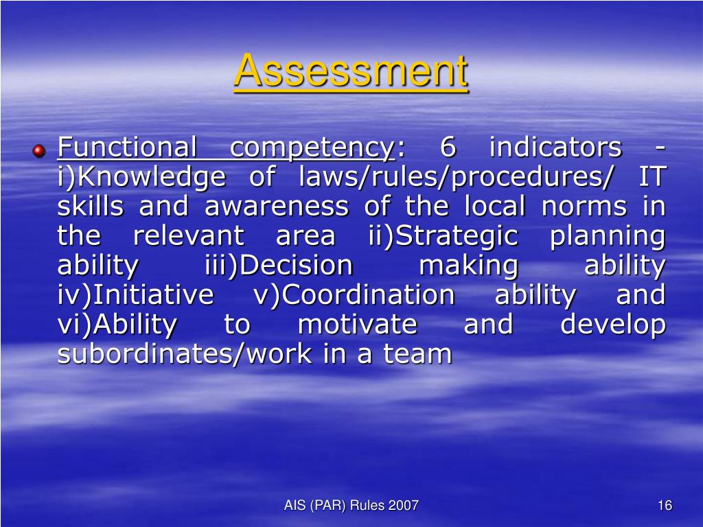 Assessment • Functional competency: 6 indicators - i)Knowledge of laws/rules/procedures/ IT skills and awareness of the local norms in the relevant area ii)Strategic planning ability iii)Decision making ability iv)Initiative v)Coordination ability and vi)Ability to motivate and develop subordinates/work in a team AIS (PAR) Rules 2007