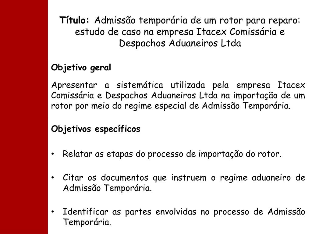 Título: Admissão temporária de um rotor para reparo: estudo de caso na empresa Itacex Comissária e Despachos Aduaneiros Ltda Objetivos específicos • Relatar as etapas do processo de importação do rotor. • Citar os documentos que instruem o regime aduaneiro de Admissão Temporária. • Identificar as partes envolvidas no processo de Admissão Temporária. Objetivo geral Apresentar a sistemática utilizada pela empresa Itacex Comissária e Despachos Aduaneiros Ltda na importação de um rotor por meio do regime especial de Admissão Temporária.