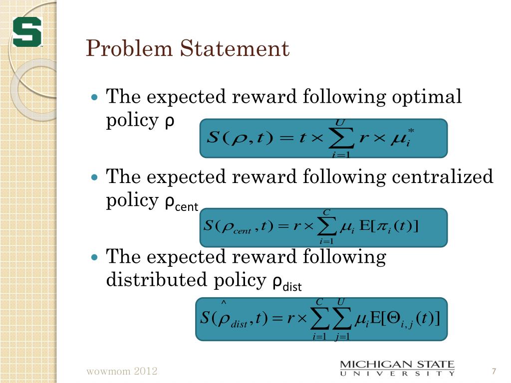 Problem Statement The expected reward following optimal policy ρ The expected reward following centralized policy ρcent The expected reward following distributed policy ρdist wowmom 2012