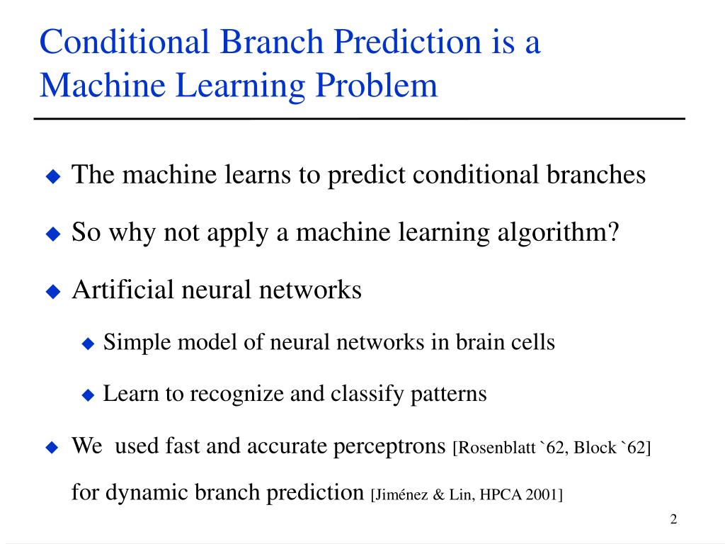 Perceptrons for Dummies. Daniel A. Jiménez Department of Computer Science Rutgers University. Conditional Branch Prediction is a Machine Learning Problem. The machine learns to predict conditional branches So why not apply a machine learning algorithm? Artificial neural networks
