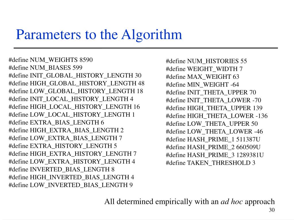 Parameters to the Algorithm #define NUM_WEIGHTS 8590 #define NUM_BIASES 599 #define INIT_GLOBAL_HISTORY_LENGTH 30 #define HIGH_GLOBAL_HISTORY_LENGTH 48 #define LOW_GLOBAL_HISTORY_LENGTH 18 #define INIT_LOCAL_HISTORY_LENGTH 4 #define HIGH_LOCAL_HISTORY_LENGTH 16 #define LOW_LOCAL_HISTORY_LENGTH 1 #define EXTRA_BIAS_LENGTH 6 #define HIGH_EXTRA_BIAS_LENGTH 2 #define LOW_EXTRA_BIAS_LENGTH 7 #define EXTRA_HISTORY_LENGTH 5 #define HIGH_EXTRA_HISTORY_LENGTH 7 #define LOW_EXTRA_HISTORY_LENGTH 4 #define INVERTED_BIAS_LENGTH 8 #define HIGH_INVERTED_BIAS_LENGTH 4 #define LOW_INVERTED_BIAS_LENGTH 9 #define NUM_HISTORIES 55 #define WEIGHT_WIDTH 7 #define MAX_WEIGHT 63 #define MIN_WEIGHT -64 #define INIT_THETA_UPPER 70 #define INIT_THETA_LOWER -70 #define HIGH_THETA_UPPER 139 #define HIGH_THETA_LOWER -136 #define LOW_THETA_UPPER 50 #define LOW_THETA_LOWER -46 #define HASH_PRIME_1 511387U #define HASH_PRIME_2 660509U #define HASH_PRIME_3 1289381U #define TAKEN_THRESHOLD 3 All determined empirically with an ad hoc approach