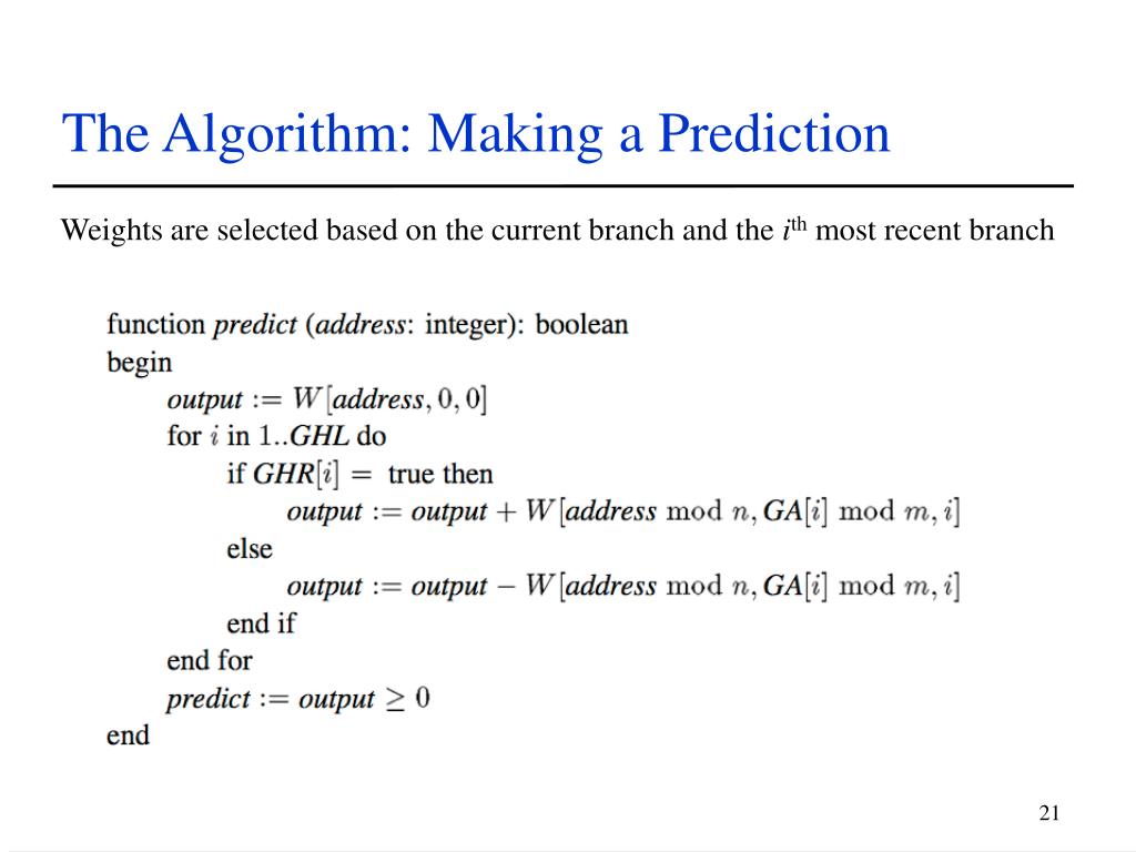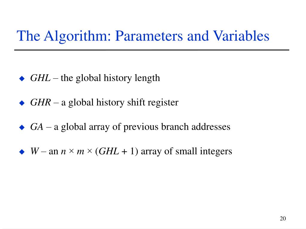 The Algorithm: Parameters and Variables • GHL – the global history length • GHR – a global history shift register • GA – a global array of previous branch addresses • W – an n× m × (GHL + 1) array of small integers