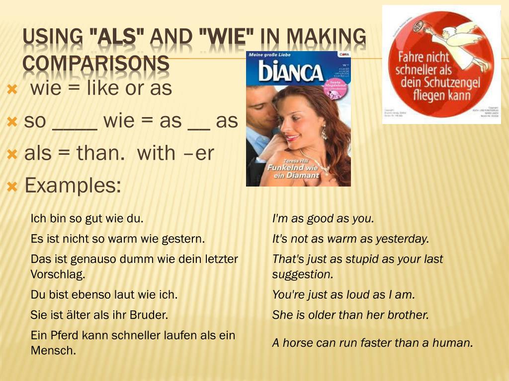 wie= like or as so ____ wie = as __ as als = than. with –er Examples: Using "als" and "wie" in making comparisons