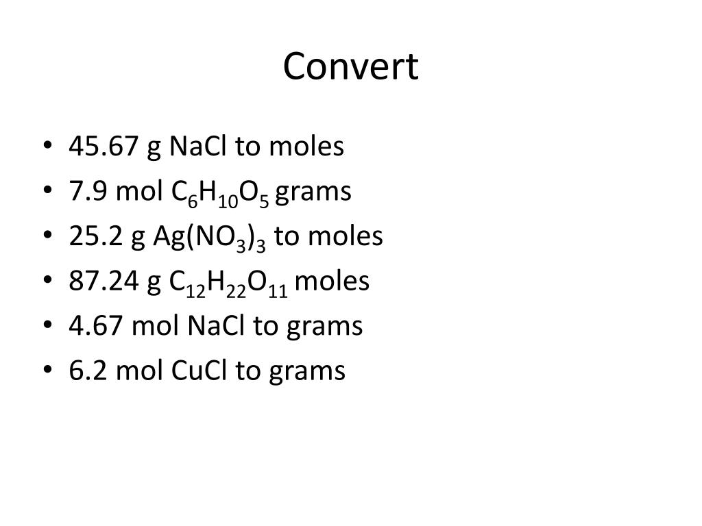 Convert • 45.67 g NaCl to moles • 7.9 molC6H10O5 grams • 25.2 g Ag(NO3)3 to moles • 87.24 g C12H22O11 moles • 4.67 molNaCl to grams • 6.2 mol CuCl to grams