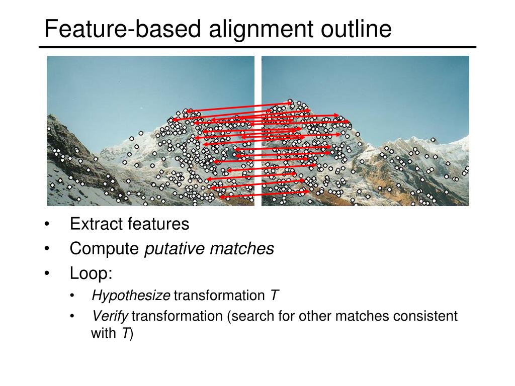 Feature-based alignment outline • Extract features • Compute putative matches • Loop: • Hypothesize transformation T