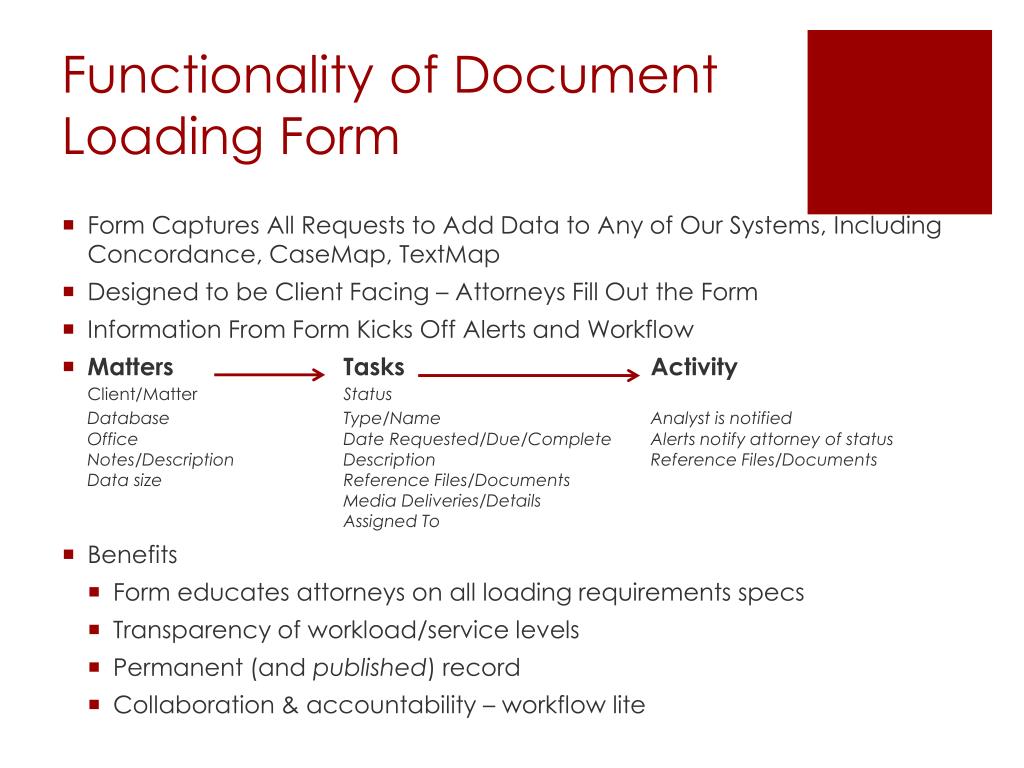 Functionality of Document Loading Form • Form Captures All Requests to Add Data to Any of Our Systems, Including Concordance, CaseMap, TextMap • Designed to be Client Facing – Attorneys Fill Out the Form • Information From Form Kicks Off Alerts and Workflow • MattersTasksActivity Client/MatterStatus Database Type/Name Analyst is notified Office Date Requested/Due/Complete Alerts notify attorney of status Notes/Description Description Reference Files/Documents Data size Reference Files/Documents Media Deliveries/Details Assigned To • Benefits • Form educates attorneys on all loading requirements specs • Transparency of workload/service levels • Permanent (and published) record • Collaboration & accountability – workflow lite