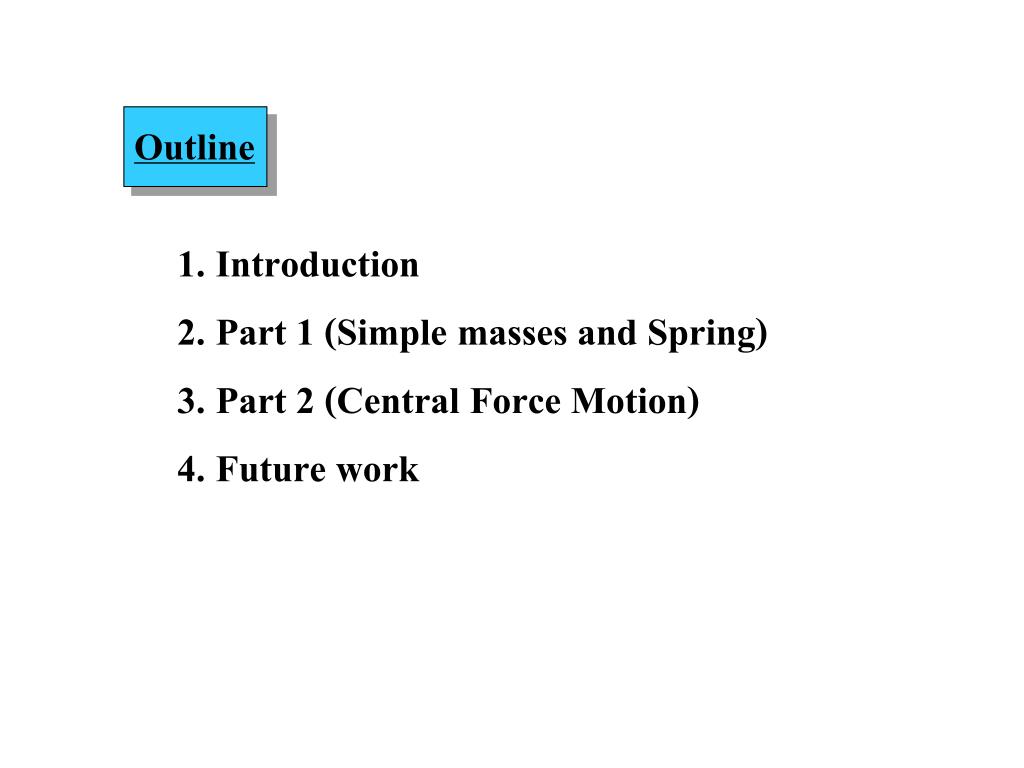 Outline • Introduction • Part 1 (Simple masses and Spring) • Part 2 (Central Force Motion) • Future work