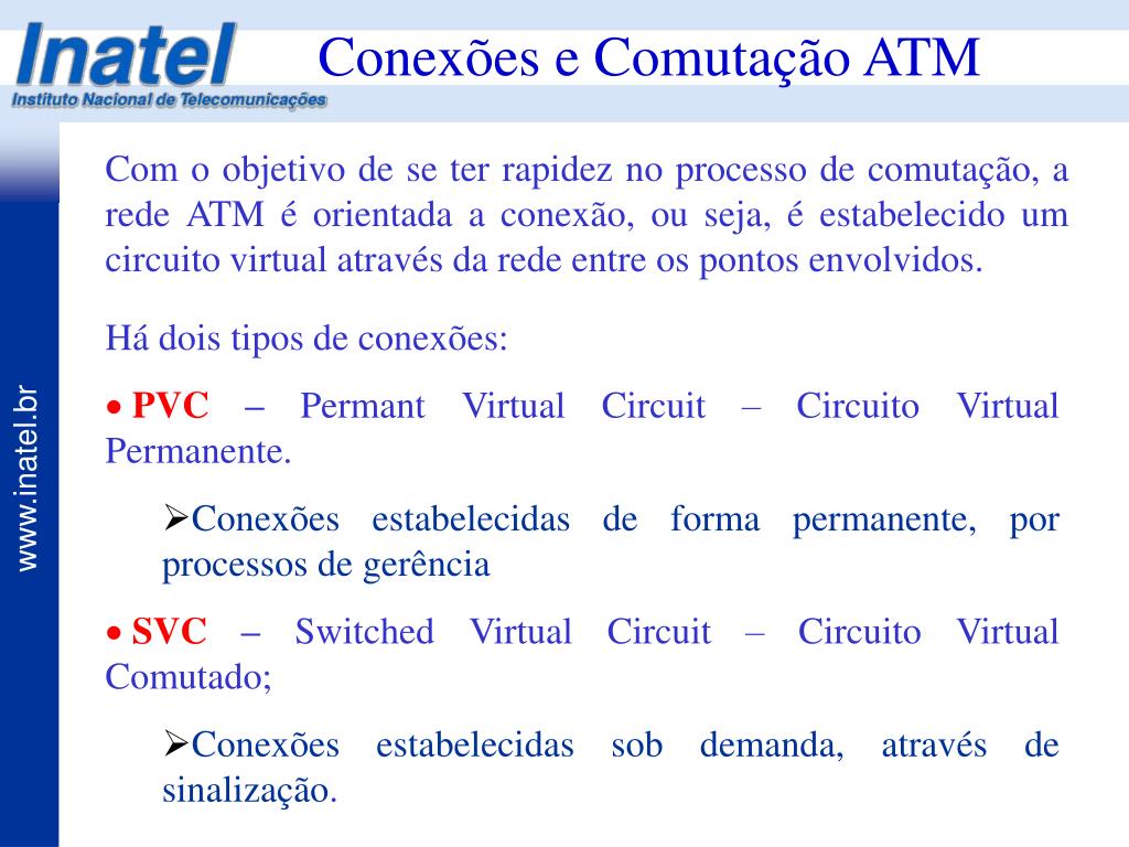 Conexões e Comutação ATM Com o objetivo de se ter rapidez no processo de comutação, a rede ATM é orientada a conexão, ou seja, é estabelecido um circuito virtual através da rede entre os pontos envolvidos. Há dois tipos de conexões: • PVC – Permant Virtual Circuit – Circuito Virtual Permanente. • Conexões estabelecidas de forma permanente, por processos de gerência • SVC – Switched Virtual Circuit – Circuito Virtual Comutado; • Conexões estabelecidas sob demanda, através de sinalização.