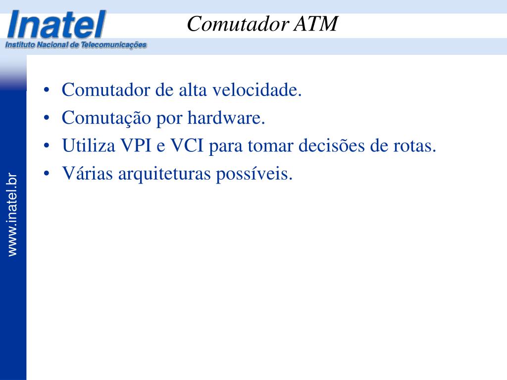 Comutador ATM • Comutador de alta velocidade. • Comutação por hardware. • Utiliza VPI e VCI para tomar decisões de rotas. • Várias arquiteturas possíveis.