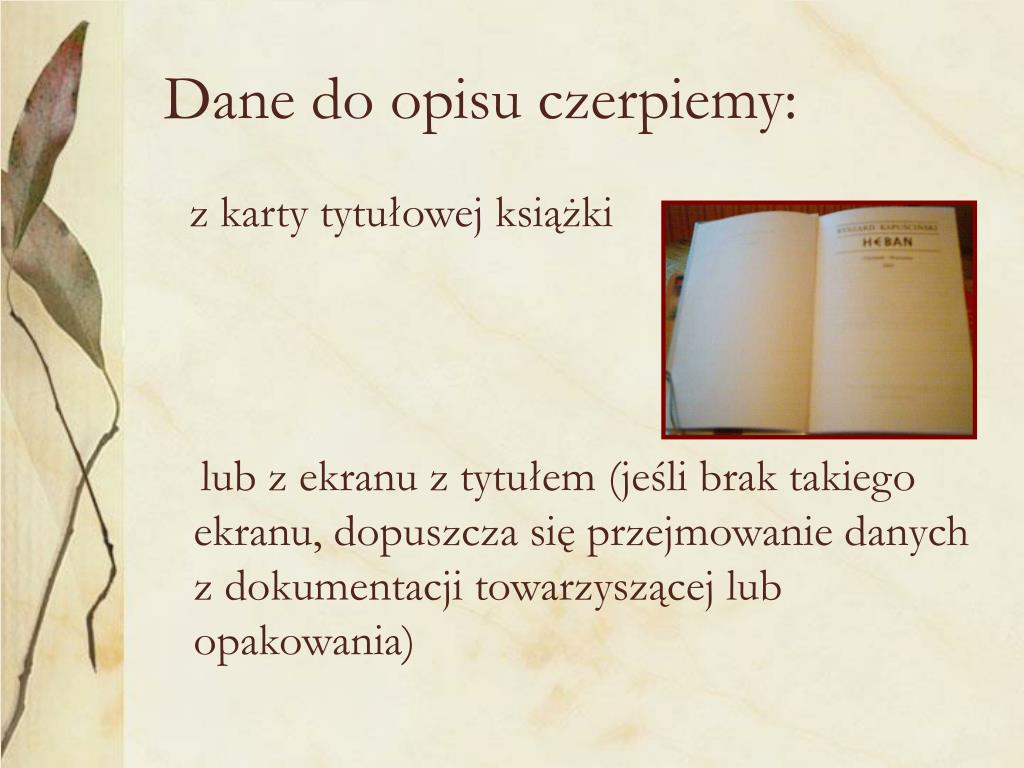 Dane do opisu czerpiemy: z karty tytułowej książki lub z ekranu z tytułem (jeśli brak takiego ekranu, dopuszcza się przejmowanie danych z dokumentacji towarzyszącej lub opakowania)