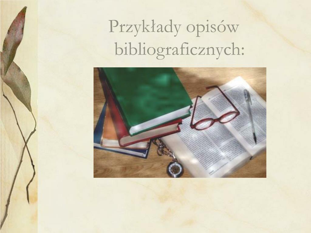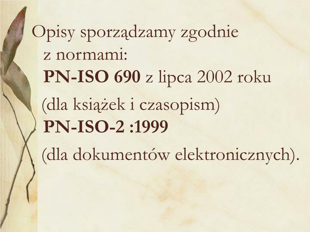 Opisy sporządzamy zgodnie z normami:PN-ISO 690 z lipca 2002 roku (dla książek i czasopism) PN-ISO-2 :1999 (dla dokumentów elektronicznych).