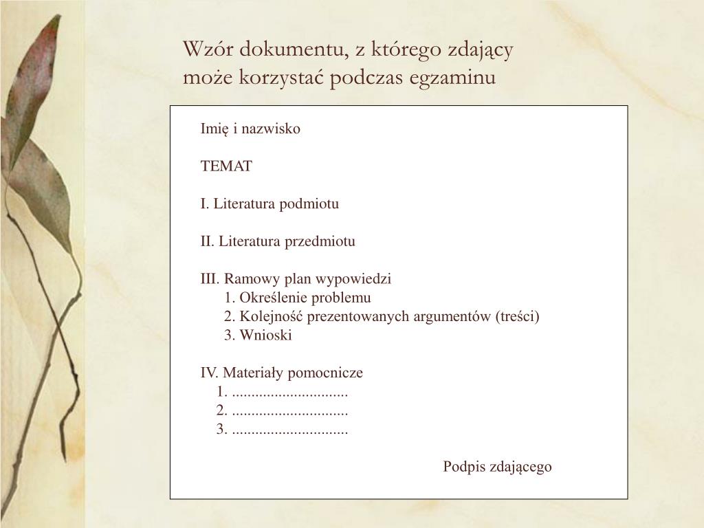 Imię i nazwiskoTEMATI. Literatura podmiotuII. Literatura przedmiotuIII. Ramowy plan wypowiedzi 1. Określenie problemu 2. Kolejność prezentowanych argumentów (treści) 3. WnioskiIV. Materiały pomocnicze 1. .............................. 2. .............................. 3. .............................. Podpis zdającego Wzór dokumentu, z którego zdającymoże korzystać podczas egzaminu