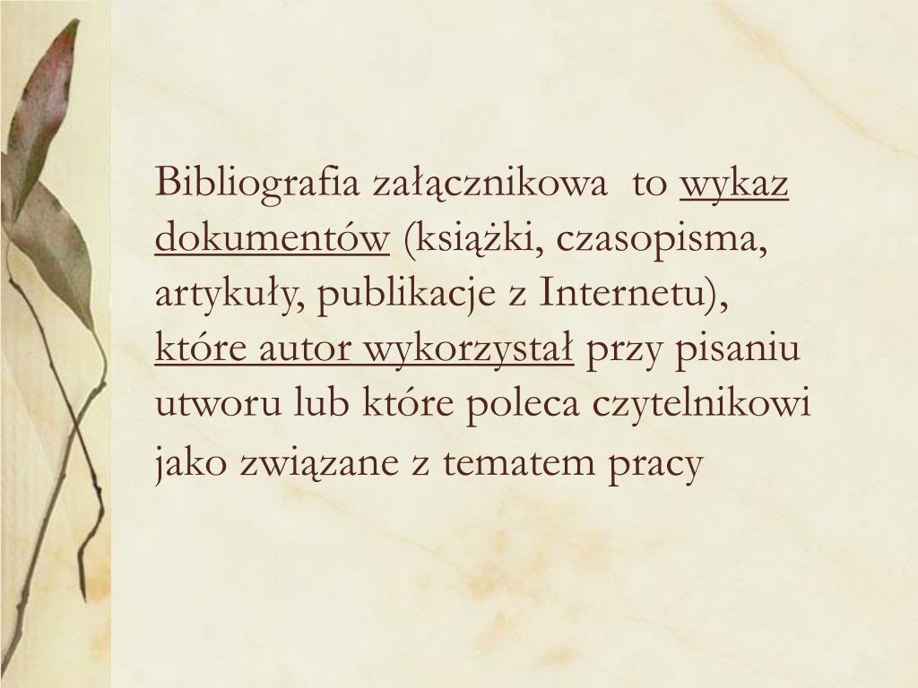 Bibliografia załącznikowa to wykaz dokumentów (książki, czasopisma, artykuły, publikacje z Internetu), które autor wykorzystał przy pisaniuutworu lub które poleca czytelnikowi jako związane z tematem pracy