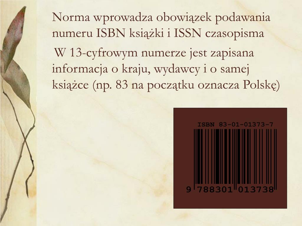 Norma wprowadza obowiązek podawania numeru ISBN książki i ISSN czasopisma W 13-cyfrowym numerze jest zapisana informacja o kraju, wydawcy i o samej książce (np. 83 na początku oznacza Polskę)