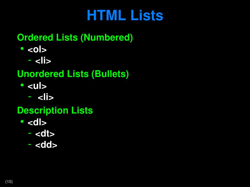 HTML Lists • Ordered Lists (Numbered) • <ol> • <li> • Unordered Lists (Bullets) • <ul> • <li> • Description Lists • <dl> • <dt> • <dd>