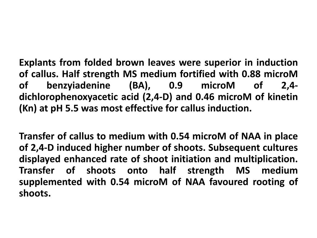 Explants from folded brown leaves were superior in induction of callus. Half strength MS medium fortified with 0.88 microM of benzyiadenine (BA), 0.9 microM of 2,4-dichlorophenoxyacetic acid (2,4-D) and 0.46 microM of kinetin (Kn) at pH 5.5 was most effective for callus induction. Transfer of callus to medium with 0.54 microM of NAA in place of 2,4-D induced higher number of shoots. Subsequent cultures displayed enhanced rate of shoot initiation and multiplication. Transfer of shoots onto half strength MS medium supplemented with 0.54 microM of NAA favoured rooting of shoots.