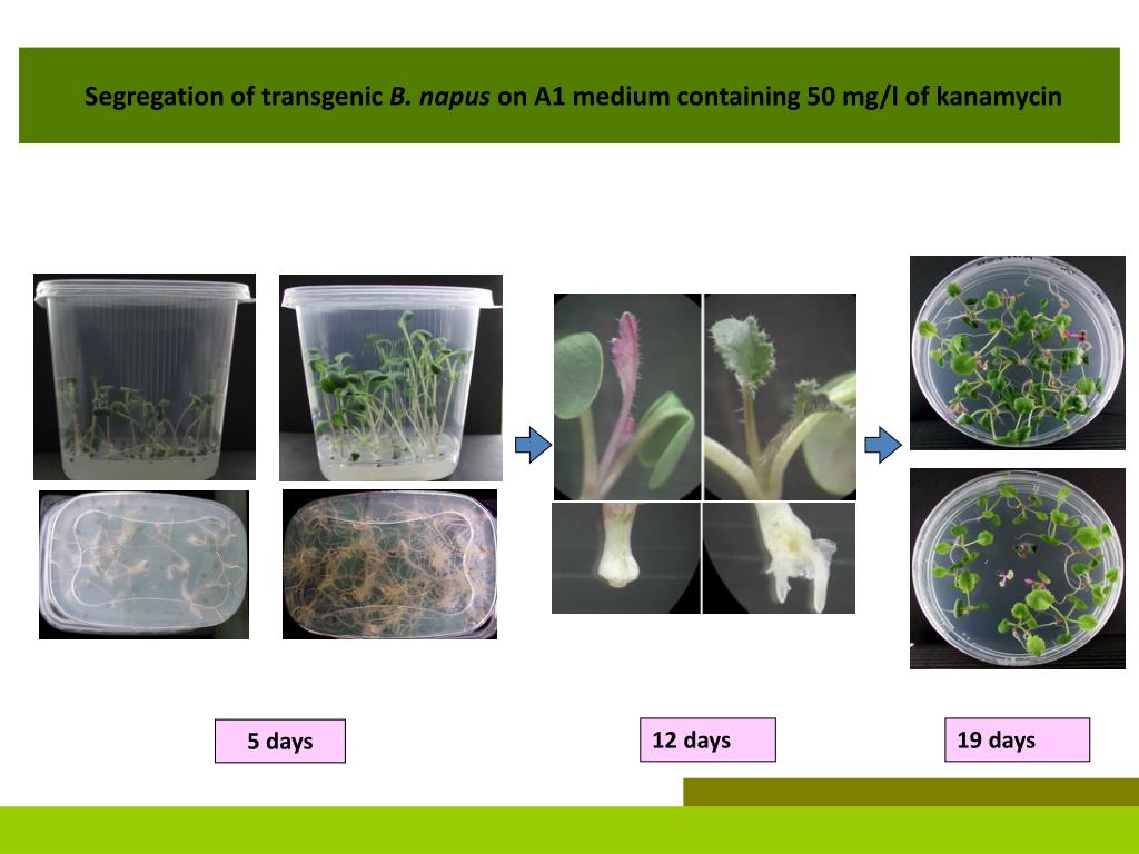 Segregation of transgenic B. napus on A1 medium containing 50 mg/l of kanamycin Wt Transformants Wt Transformant Transformants back side back side 12 days 19 days 5 days 22/3/07