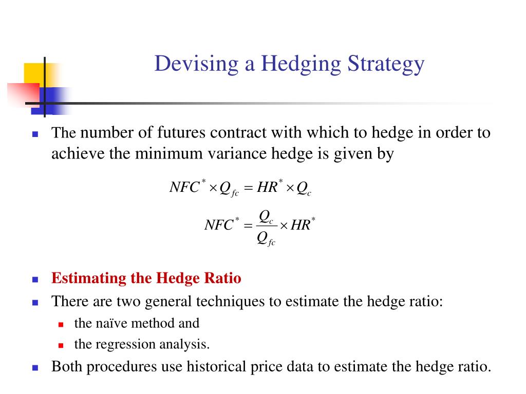 Devising a Hedging Strategy • The number of futures contract with which to hedge in order to achieve the minimum variance hedge is given by • Estimating the Hedge Ratio • There are two general techniques to estimate the hedge ratio: • the naïve method and • the regression analysis. • Both procedures use historical price data to estimate the hedge ratio.