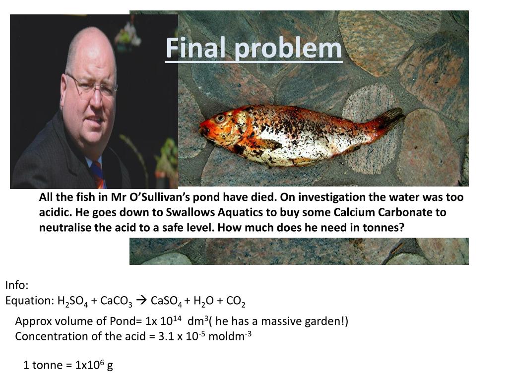 Final problem All the fish in Mr O’Sullivan’s pond have died. On investigation the water was too acidic. He goes down to Swallows Aquatics to buy some Calcium Carbonate to neutralise the acid to a safe level. How much does he need in tonnes? Info: Equation: H2SO4 + CaCO3 CaSO4 + H2O + CO2 Approx volume of Pond= 1x 1014 dm3( he has a massive garden!) Concentration of the acid = 3.1 x 10-5 moldm-3 1 tonne = 1x106 g