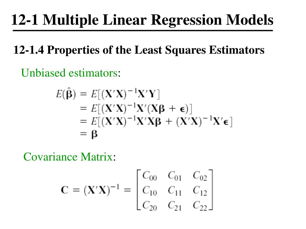 12-1 Multiple Linear Regression Models 12-1.4 Properties of the Least Squares Estimators Individual variances and covariances: In general,