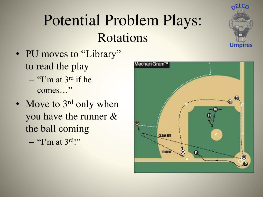 Potential Problem Plays:Rotations • PU moves to “Library” to read the play • “I’m at 3rd if he comes…” • Move to 3rd only when you have the runner & the ball coming • “I’m at 3rd!”