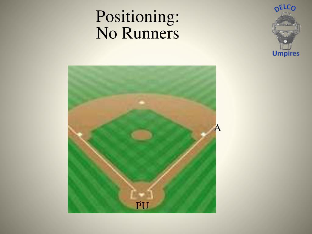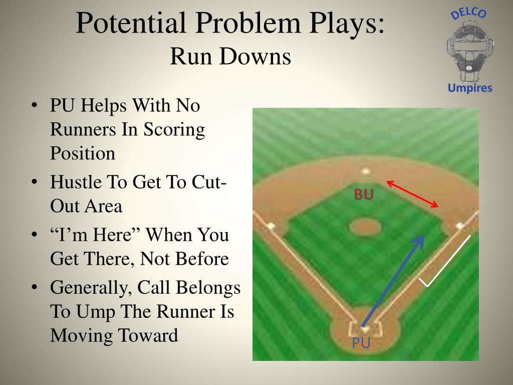 Potential Problem Plays:Run Downs • PU Helps With No Runners In Scoring Position • Hustle To Get To Cut-Out Area • “I’m Here” When You Get There, Not Before • Generally, Call Belongs To Ump The Runner Is Moving Toward BU C B PU