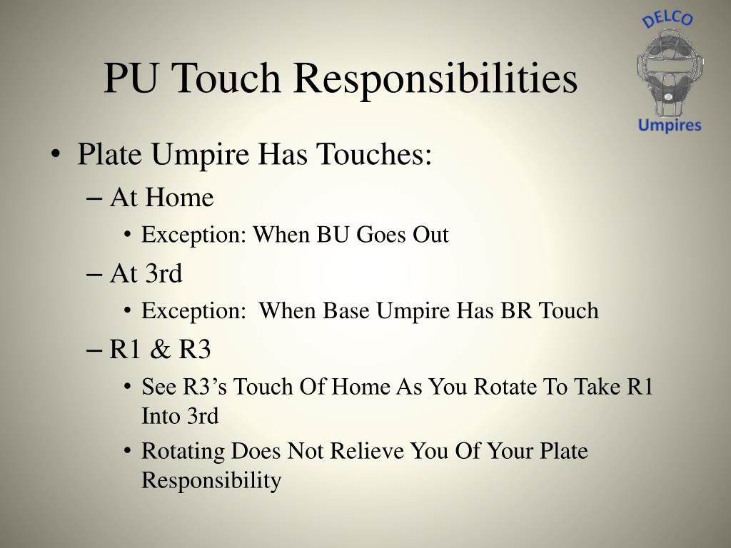 PU Touch Responsibilities • Plate Umpire Has Touches: • At Home • Exception: When BU Goes Out • At 3rd • Exception: When Base Umpire Has BR Touch • R1 & R3 • See R3’s Touch Of Home As You Rotate To Take R1 Into 3rd • Rotating Does Not Relieve You Of Your Plate Responsibility