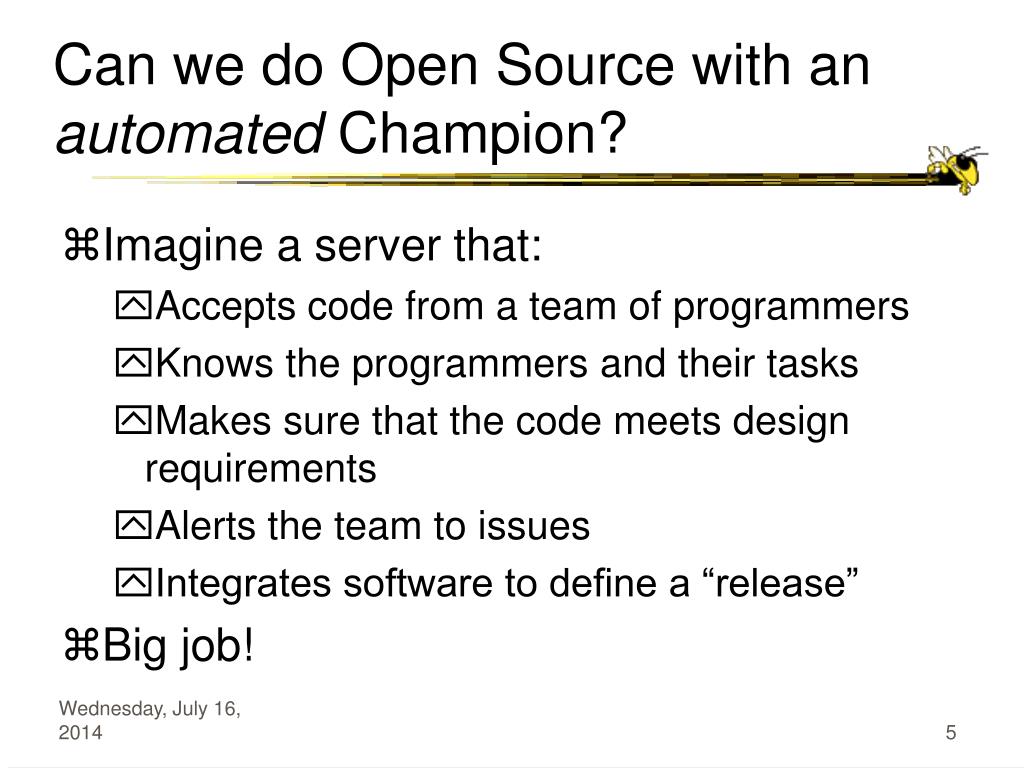 Can we do Open Source with an automated Champion? • Imagine a server that: • Accepts code from a team of programmers • Knows the programmers and their tasks • Makes sure that the code meets design requirements • Alerts the team to issues • Integrates software to define a “release” • Big job!