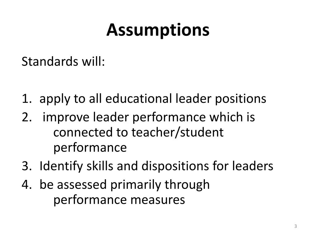 Assumptions Standards will: • apply to all educational leader positions • improve leader performance which is connected to teacher/student performance • Identify skills and dispositions for leaders • be assessed primarily through performance measures