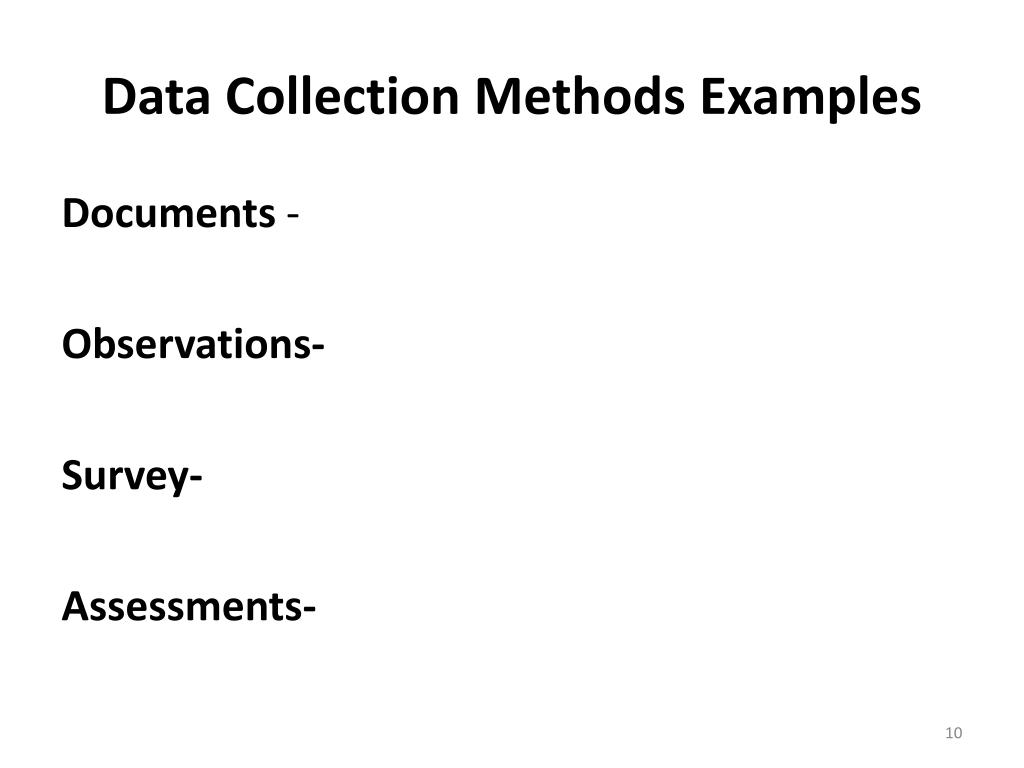 Data Collection MethodsExamples Documents - Observations- Survey- Assessments-