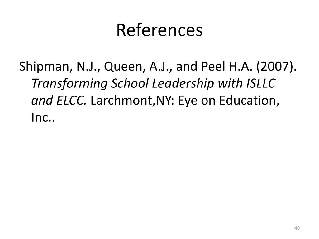 References Shipman, N.J., Queen, A.J., and Peel H.A. (2007). Transforming School Leadership with ISLLC and ELCC. Larchmont,NY: Eye on Education, Inc..
