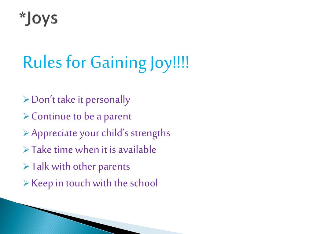 *Joys Rules for Gaining Joy!!!! • Don’t take it personally • Continue to be a parent • Appreciate your child’s strengths • Take time when it is available • Talk with other parents • Keep in touch with the school