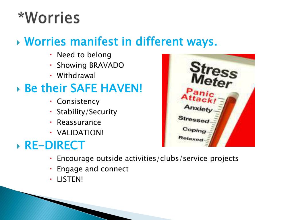 *Worries • Worries manifest in different ways. • Need to belong • Showing BRAVADO • Withdrawal • Be their SAFE HAVEN! • Consistency • Stability/Security • Reassurance • VALIDATION! • RE-DIRECT • Encourage outside activities/clubs/service projects • Engage and connect • LISTEN!
