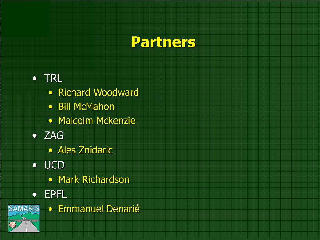 Partners • TRL • Richard Woodward • Bill McMahon • Malcolm Mckenzie • ZAG • Ales Znidaric • UCD • Mark Richardson • EPFL • Emmanuel Denarié