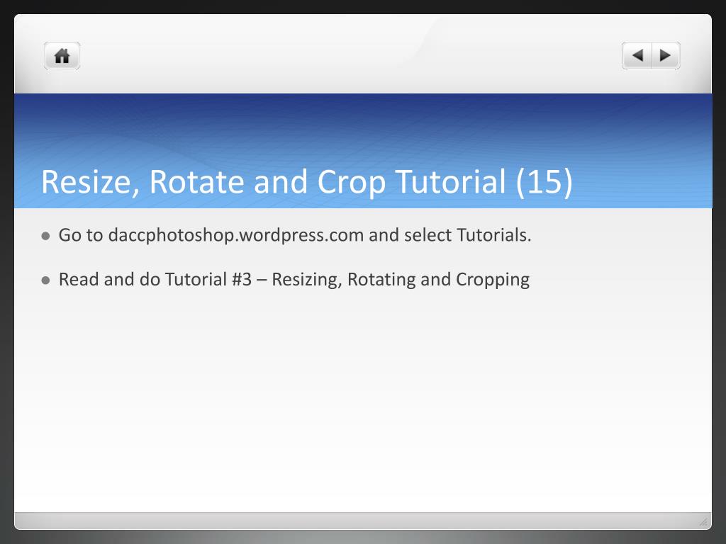 Resize, Rotate and Crop Tutorial (15) • Go to daccphotoshop.wordpress.com and select Tutorials. • Read and do Tutorial #3 – Resizing, Rotating and Cropping