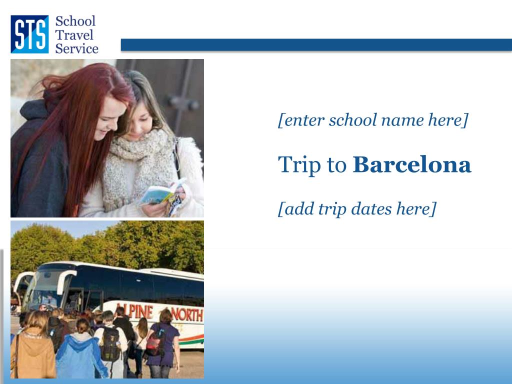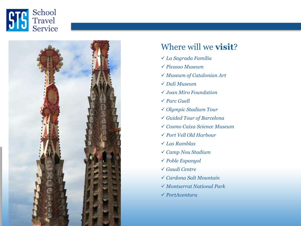 BARCELONA. Inspiring young minds since 1933. [enter school name here] Trip to Barcelona [add trip dates here]. Where are we going ?. “. The trip was a huge success , thank you so much for all your efforts . I look forward to another trip with STS this time next year.