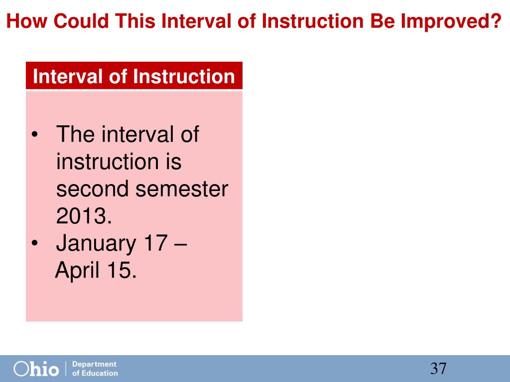 Sample Interval of Instruction This is a yearlong course taught in one 41 minute period per day. The SLO interval of instruction begins August 27, 2013, and ends on April 15, 2014.