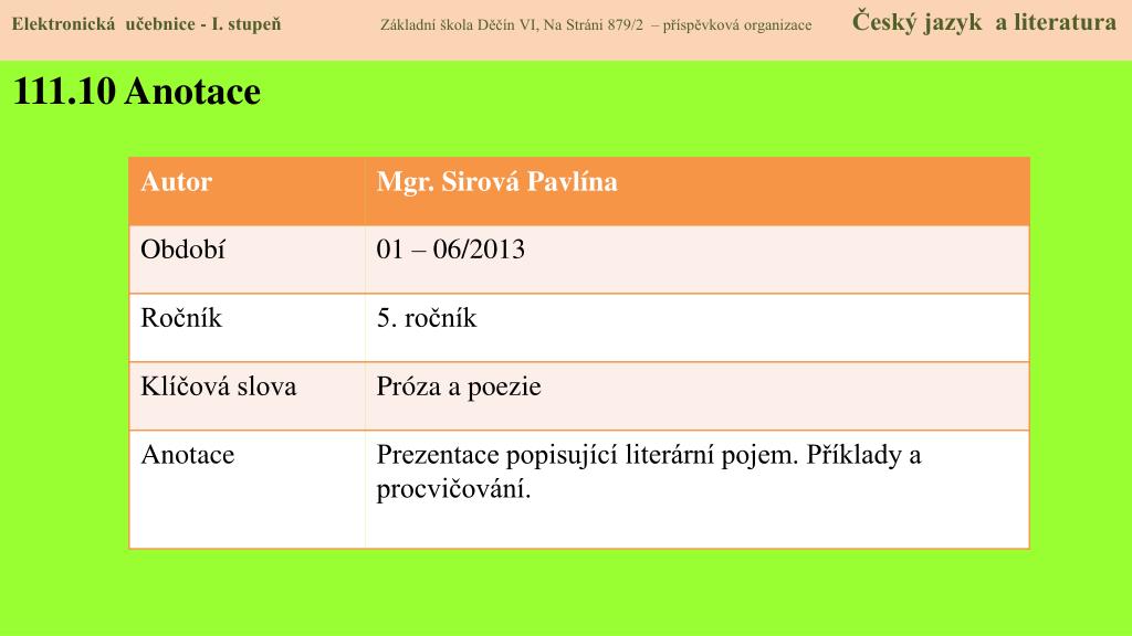 Elektronická učebnice - I. stupeň Základní škola Děčín VI, Na Stráni 879/2 – příspěvková organizace Český jazyk a literatura 111.10 Anotace
