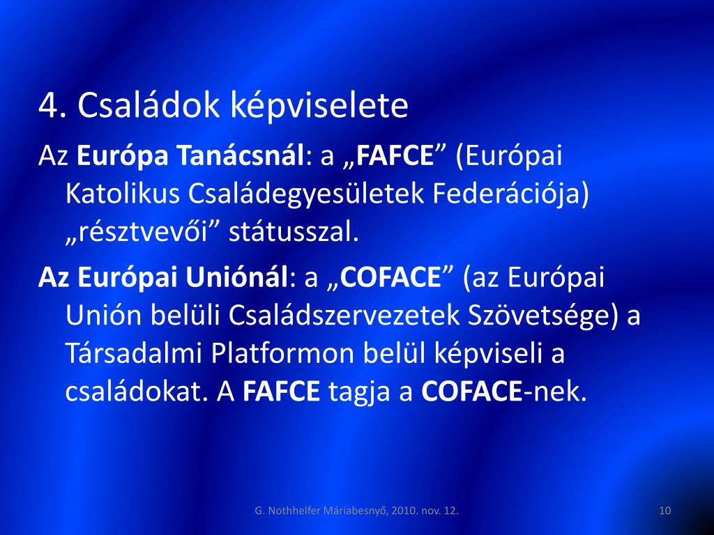 4. Családok képviselete Az Európa Tanácsnál: a „FAFCE” (Európai Katolikus Családegyesületek Federációja) „résztvevői” státusszal. Az Európai Uniónál: a „COFACE” (az Európai Unión belüli Családszervezetek Szövetsége) a Társadalmi Platformon belül képviseli a családokat. A FAFCE tagja a COFACE-nek. G. Nothhelfer Máriabesnyő, 2010. nov. 12.