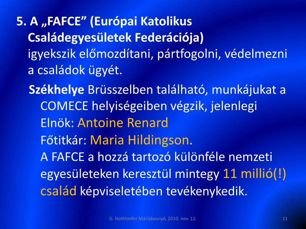 5. A „FAFCE” (Európai Katolikus Családegyesületek Federációja) igyekszik előmozdítani, pártfogolni, védelmezni a családok ügyét. Székhelye Brüsszelben található, munkájukat a COMECE helyiségeiben végzik, jelenlegi Elnök: Antoine RenardFőtitkár: Maria Hildingson. A FAFCE a hozzá tartozó különféle nemzeti egyesületeken keresztül mintegy 11 millió(!) család képviseletében tevékenykedik. G. Nothhelfer Máriabesnyő, 2010. nov. 12.