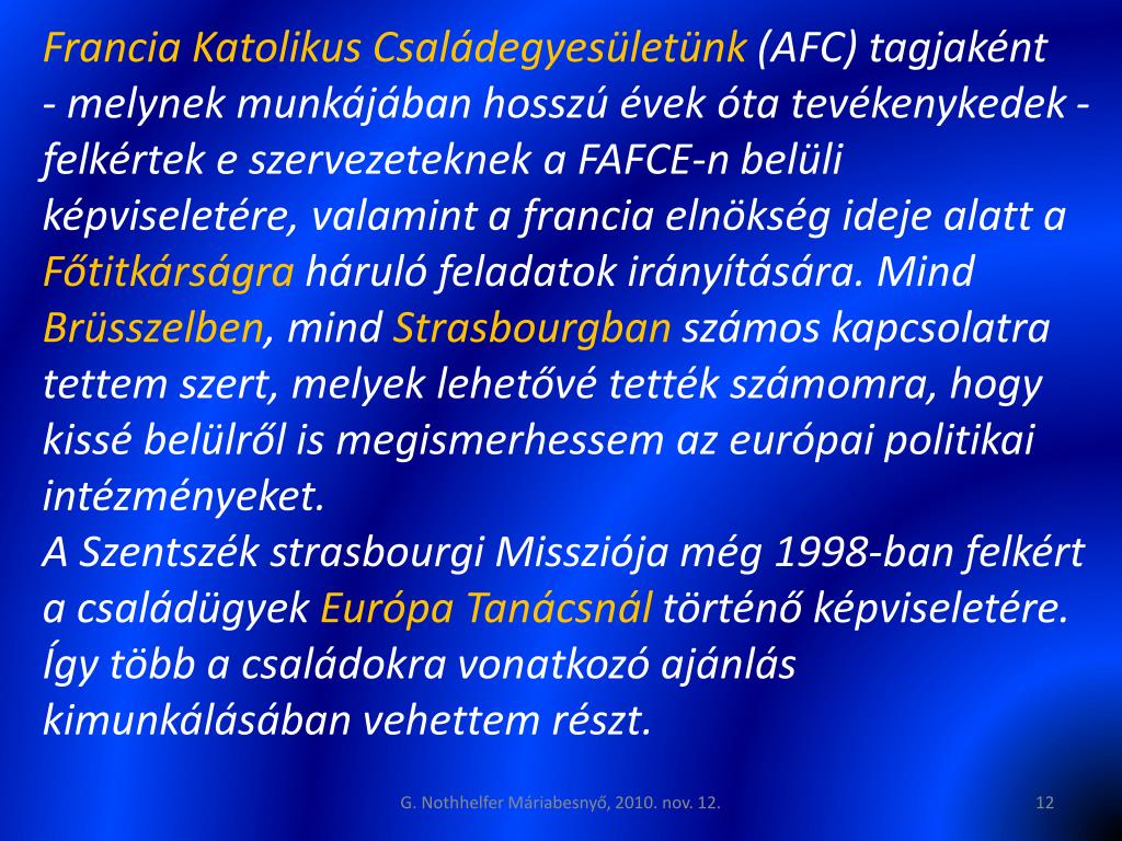 Francia Katolikus Családegyesületünk (AFC) tagjaként- melynek munkájában hosszú évek óta tevékenykedek - felkértek e szervezeteknek a FAFCE-n belüli képviseletére, valamint a francia elnökség ideje alatt a Főtitkárságra háruló feladatok irányítására. Mind Brüsszelben, mind Strasbourgban számos kapcsolatra tettem szert, melyek lehetővé tették számomra, hogy kissé belülről is megismerhessem az európai politikai intézményeket. A Szentszék strasbourgi Missziója még 1998-ban felkért a családügyek Európa Tanácsnál történő képviseletére. Így több a családokra vonatkozó ajánlás kimunkálásában vehettem részt. G. Nothhelfer Máriabesnyő, 2010. nov. 12.