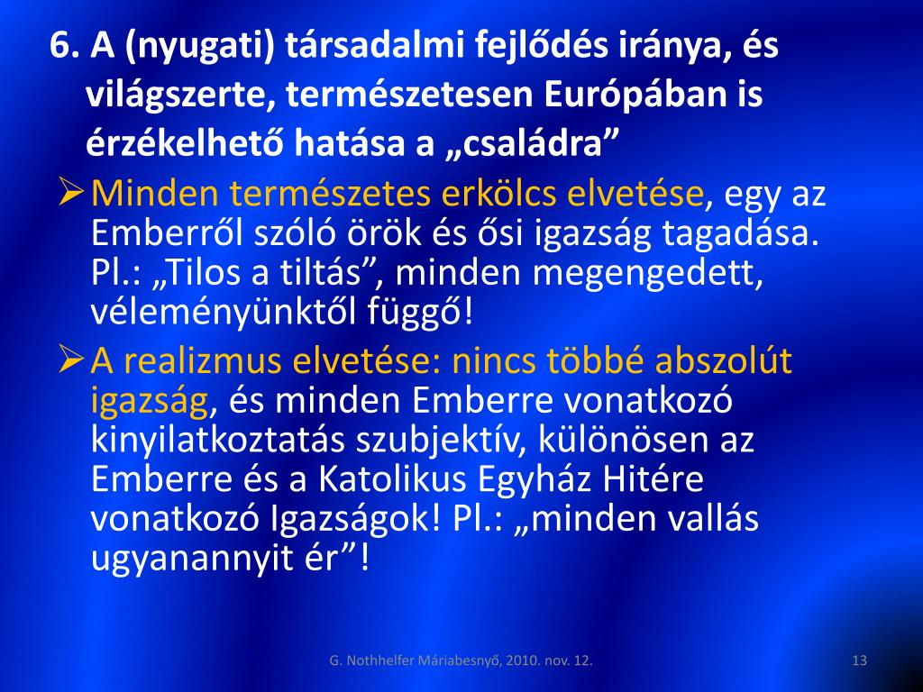 6. A (nyugati) társadalmi fejlődés iránya, és világszerte, természetesen Európában is érzékelhető hatása a „családra” • Minden természetes erkölcs elvetése, egy az Emberről szóló örök és ősi igazság tagadása. Pl.: „Tilos a tiltás”, minden megengedett, véleményünktől függő! • A realizmus elvetése: nincs többé abszolút igazság, és minden Emberre vonatkozó kinyilatkoztatás szubjektív, különösen az Emberre és a Katolikus Egyház Hitére vonatkozó Igazságok! Pl.: „minden vallás ugyanannyit ér”! G. Nothhelfer Máriabesnyő, 2010. nov. 12.