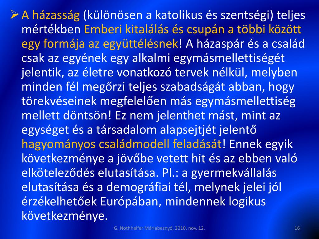 A házasság (különösen a katolikus és szentségi) teljes mértékben Emberi kitalálás és csupán a többi között egy formája az együttélésnek! A házaspár és a család csak az egyének egy alkalmi egymásmellettiségét jelentik, az életre vonatkozó tervek nélkül, melyben minden fél megőrzi teljes szabadságát abban, hogy törekvéseinek megfelelően más egymásmellettiség mellett döntsön! Ez nem jelenthet mást, mint az egységet és a társadalom alapsejtjét jelentő hagyományos családmodell feladását! Ennek egyik következménye a jövőbe vetett hit és az ebben való elköteleződés elutasítása. Pl.: a gyermekvállalás elutasítása és a demográfiai tél, melynek jelei jól érzékelhetőek Európában, mindennek logikus következménye. G. Nothhelfer Máriabesnyő, 2010. nov. 12.