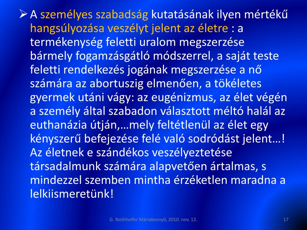 A személyes szabadság kutatásának ilyen mértékű hangsúlyozásaveszélyt jelent az életre : a termékenység feletti uralom megszerzése bármely fogamzásgátló módszerrel, a saját teste feletti rendelkezés jogának megszerzése a nő számára az abortuszig elmenően, a tökéletes gyermek utáni vágy: az eugénizmus, az élet végén a személy által szabadon választott méltó halál az euthanázia útján,…mely feltétlenül az élet egy kényszerű befejezése felé való sodródást jelent…! Az életnek e szándékos veszélyeztetése társadalmunk számára alapvetően ártalmas, s mindezzel szemben mintha érzéketlen maradna a lelkiismeretünk! G. Nothhelfer Máriabesnyő, 2010. nov. 12.