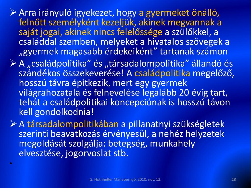 Arra irányuló igyekezet, hogy a gyermeket önálló, felnőtt személyként kezeljük, akinek megvannak a saját jogai, akinek nincs felelőssége a szülőkkel, a családdal szemben, melyeket a hivatalos szövegek a „gyermek magasabb érdekeiként” tartanak számon • A „családpolitika” és „társadalompolitika” állandó és szándékos összekeverése! A családpolitika megelőző, hosszú távra építkezik, mert egy gyermek világrahozatala és felnevelése legalább 20 évig tart, tehát a családpolitikai koncepciónak is hosszú távon kell gondolkodnia! • A társadalompolitikában a pillanatnyi szükségletek szerinti beavatkozás érvényesül, a nehéz helyzetek megoldását szolgálja: betegség, munkahely elvesztése, jogorvoslat stb. G. Nothhelfer Máriabesnyő, 2010. nov. 12.